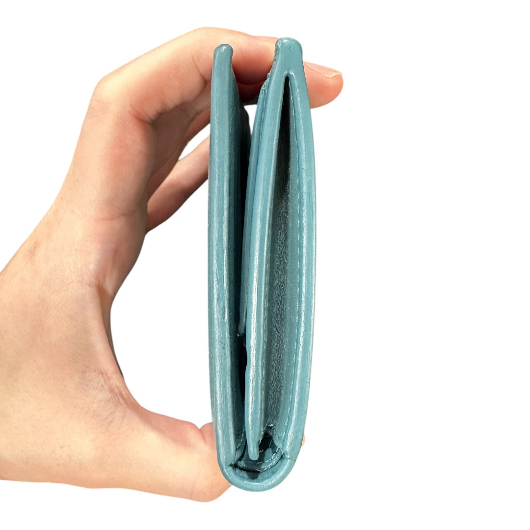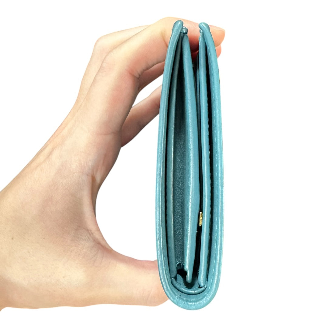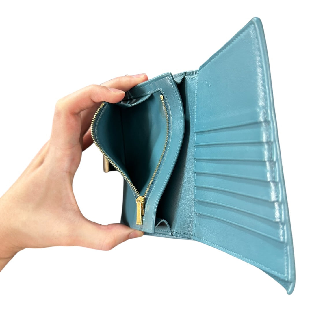 Features: Snap button flap closure, interior zippered coin compartment, multiple bill compartments, and credit card slots.