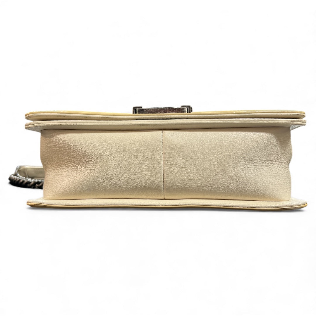 Cream and yellow quilted design shoulder bag with chain strap.