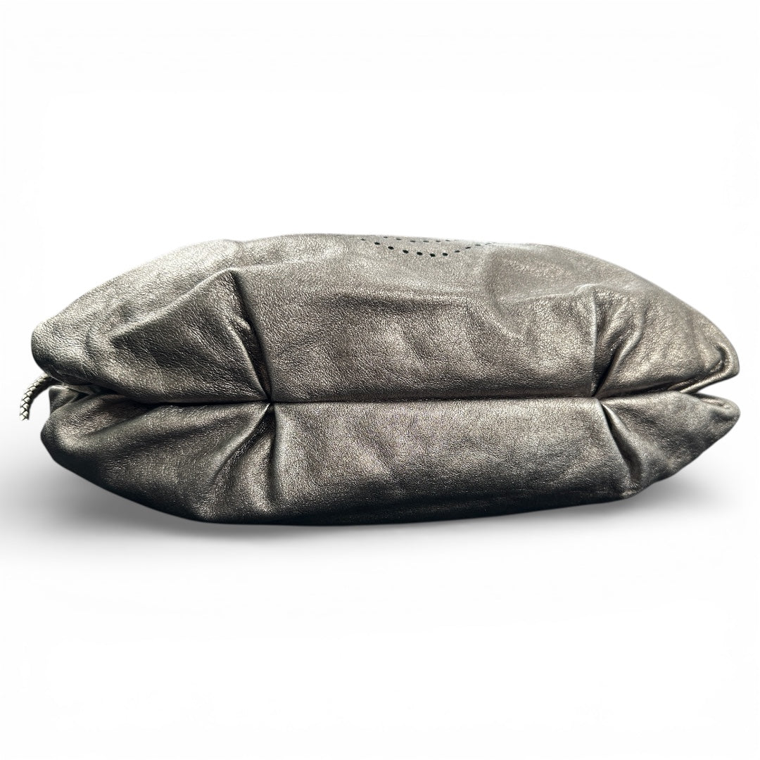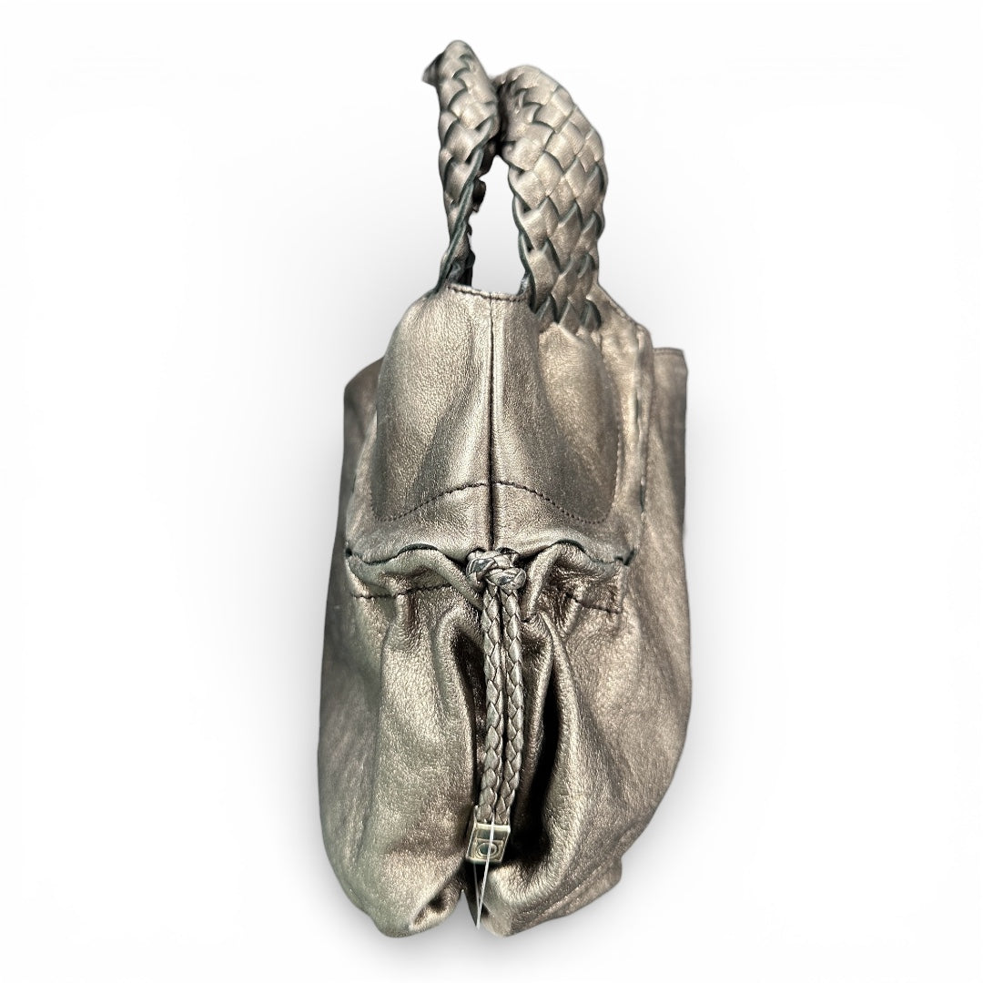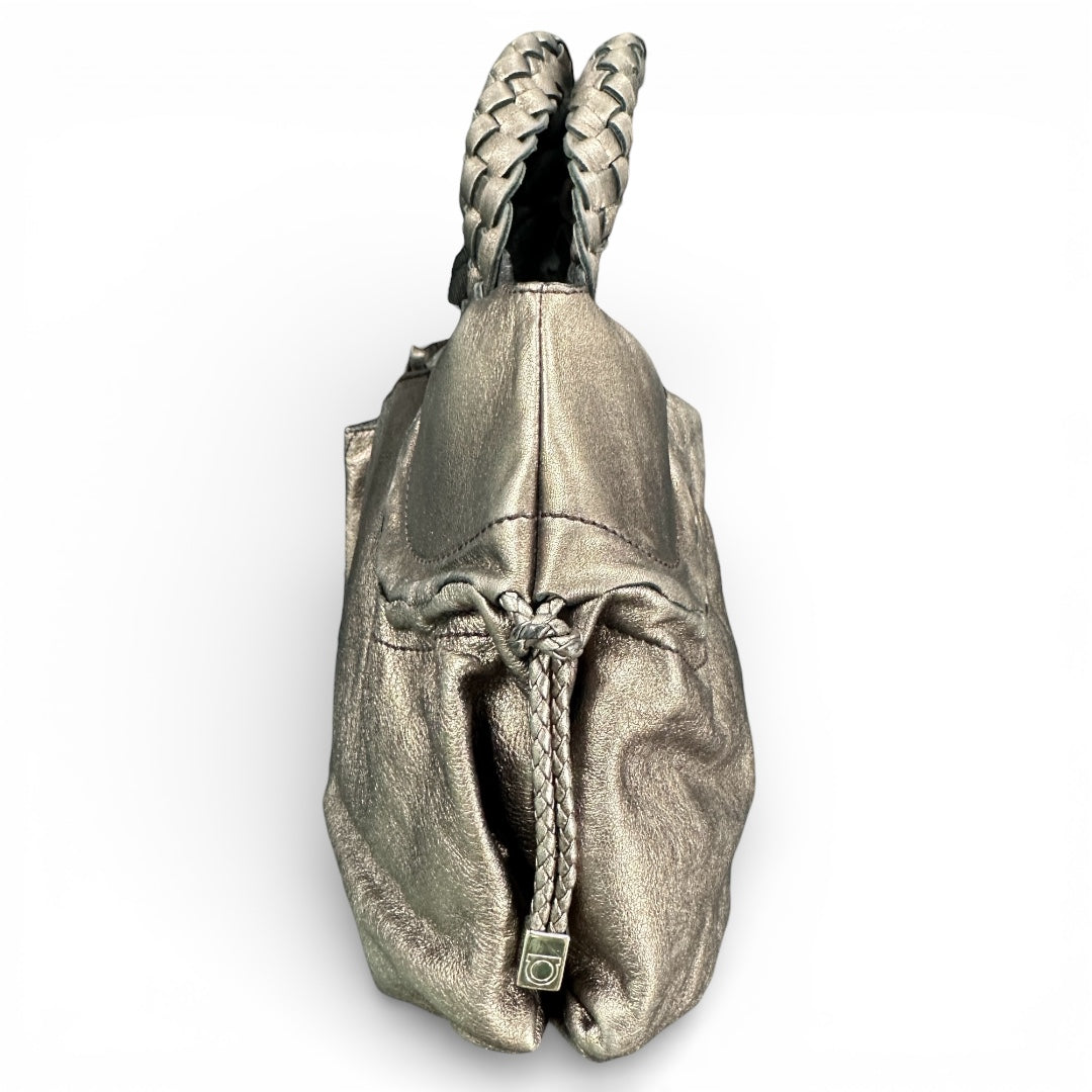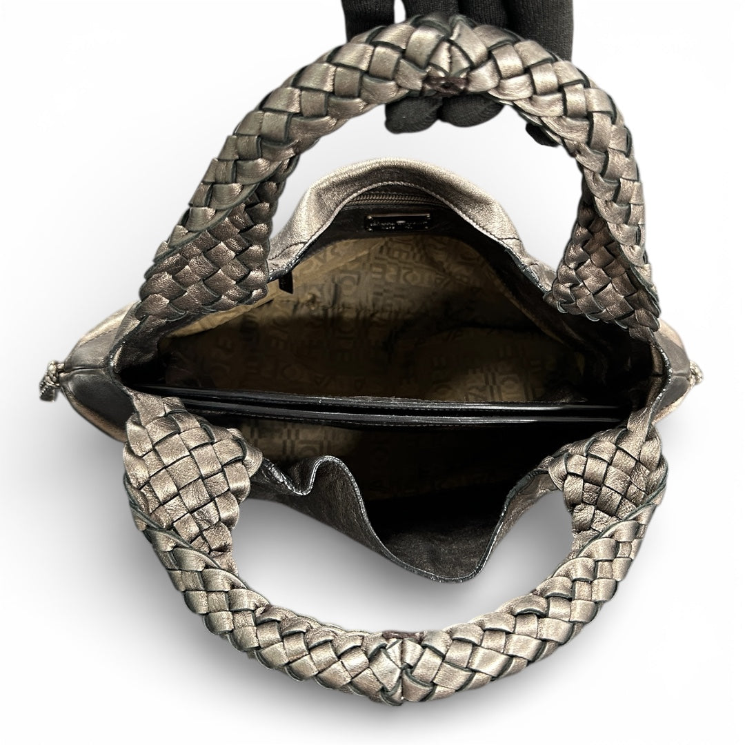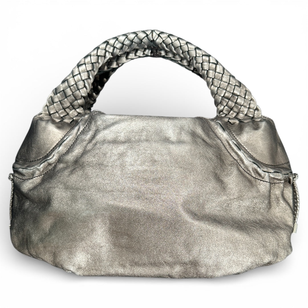 Silver leather handbag with braided handles and a zippered opening.