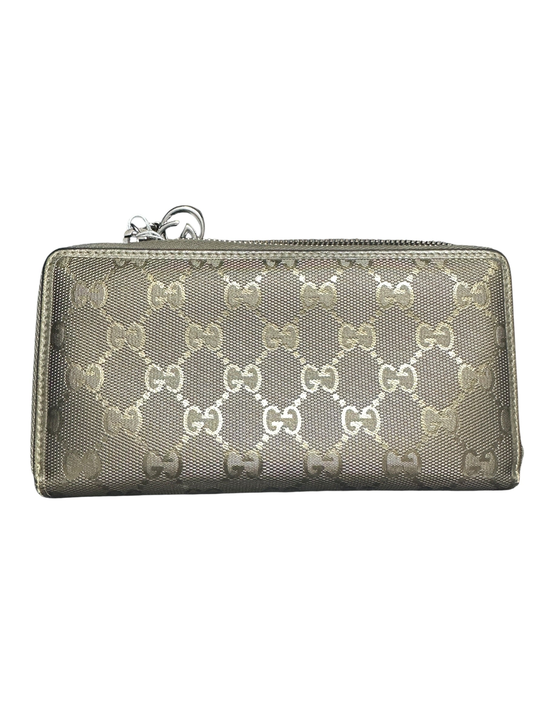 Description: A glamorous take on a signature design, this Gucci zip-around wallet features the classic GG monogram canvas with a striking metallic gold/champagne finish. The all-around zipper ensures the security of your items, while the radiant exterior adds a touch of high-fashion shimmer to your accessories.