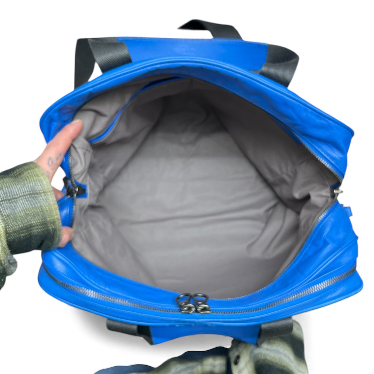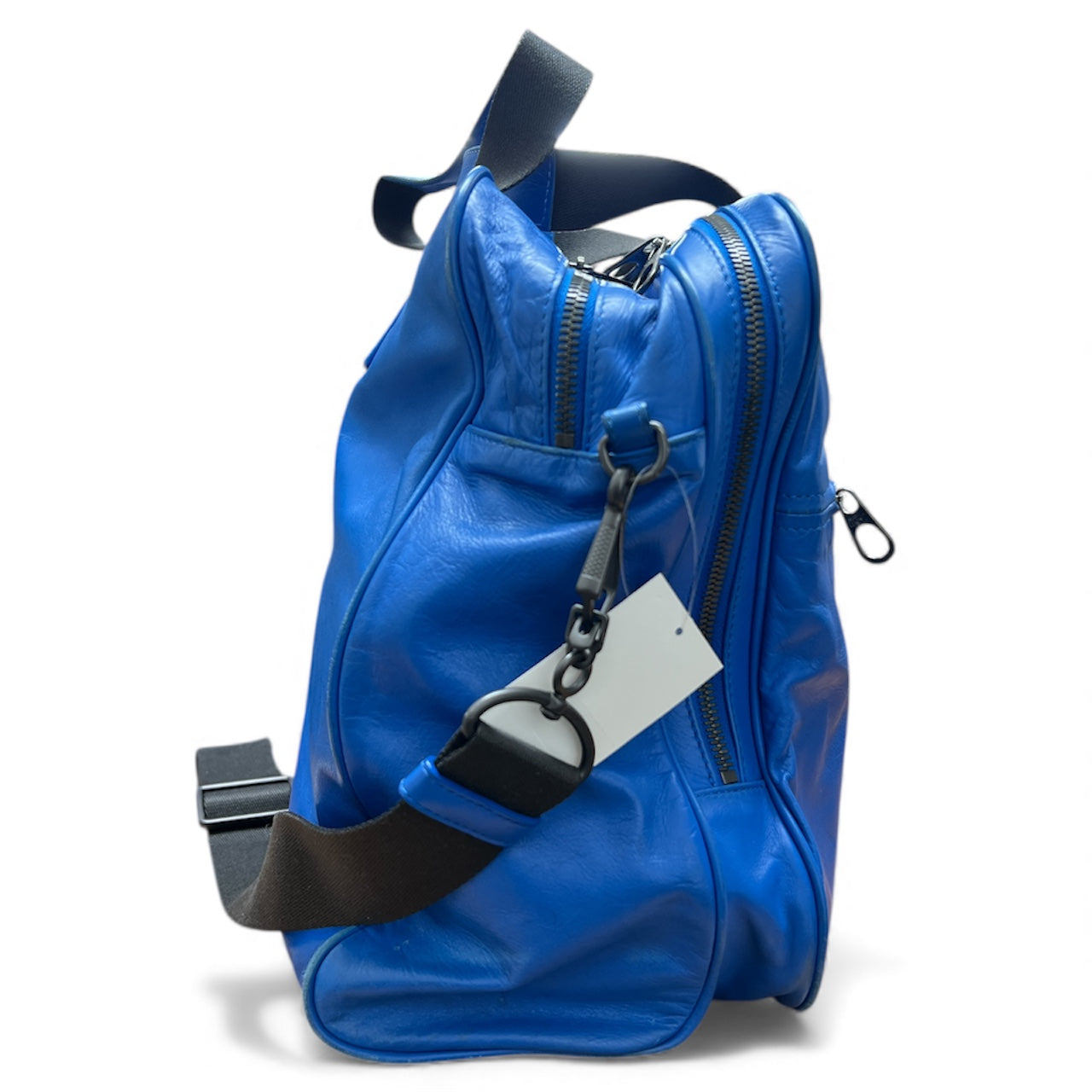 Bright blue leather shoulder bag with adjustable strap.