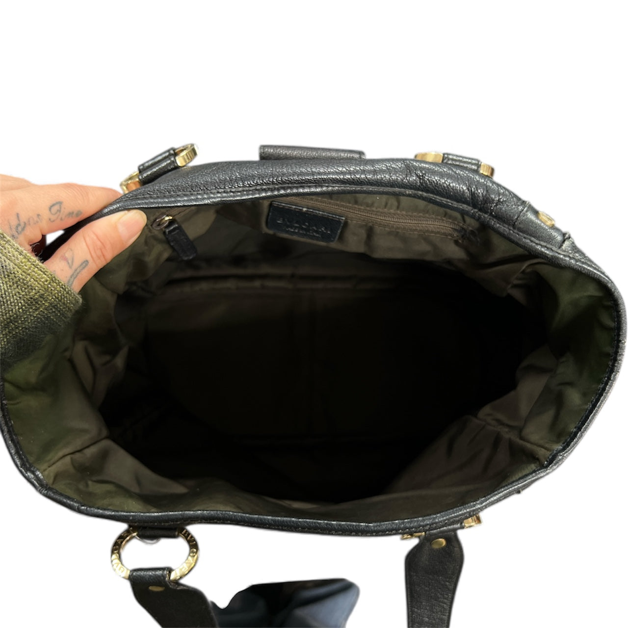 Black leather tote bag with gold-tone hardware and an exterior pocket.