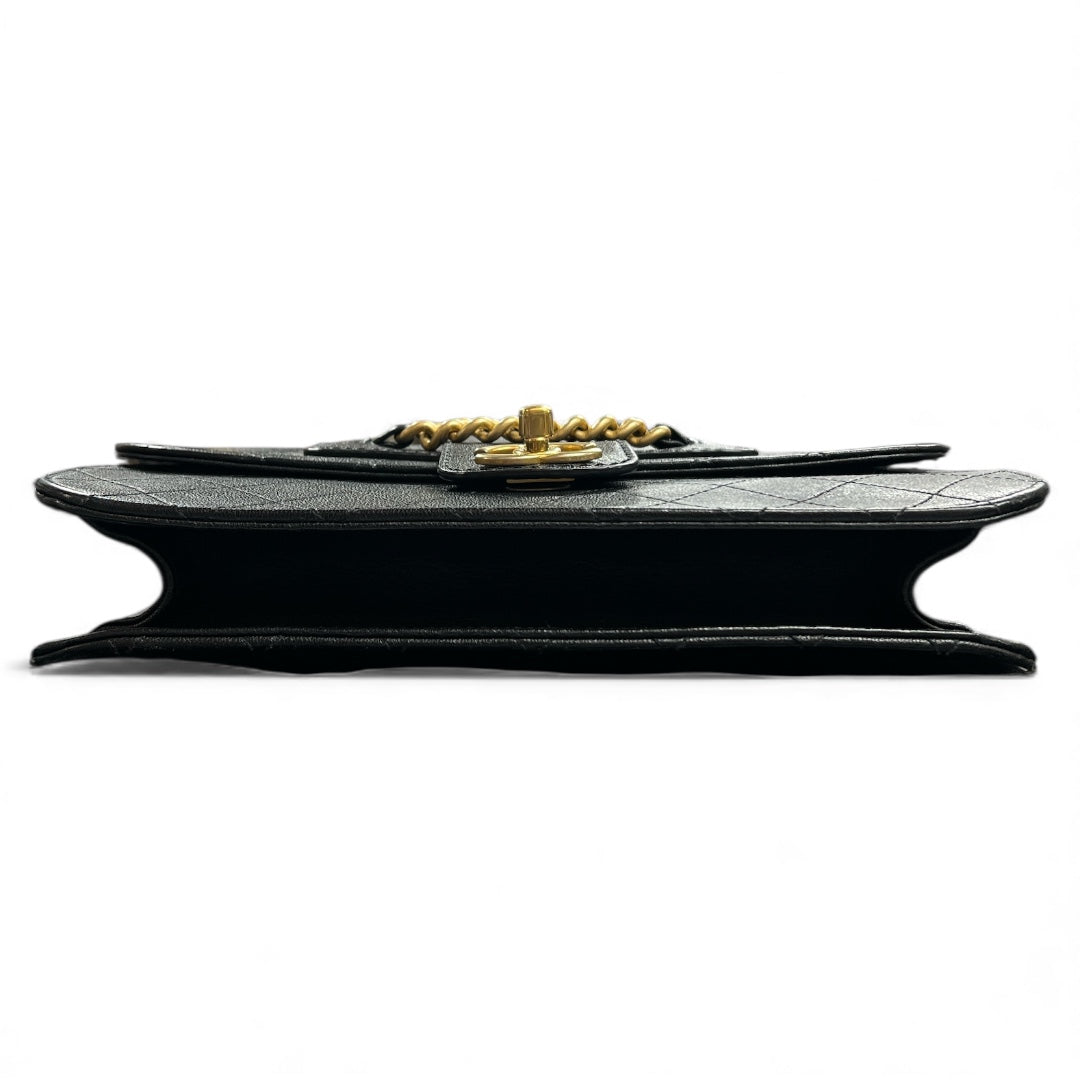 Quilted black leather shoulder bag with gold chain.