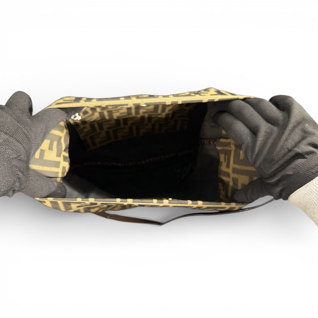 A beige and brown shoulder bag featuring the FF logo.